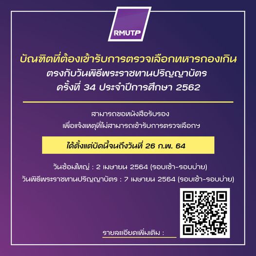 บัณฑิตที่ต้องเข้ารับการตรวจเลือกทหารกองเกิน ตรงกับวันพิธีพระราชทานปริญญาบัตร ครั้งที่ 34 ประจำปีการศึกษา 2562