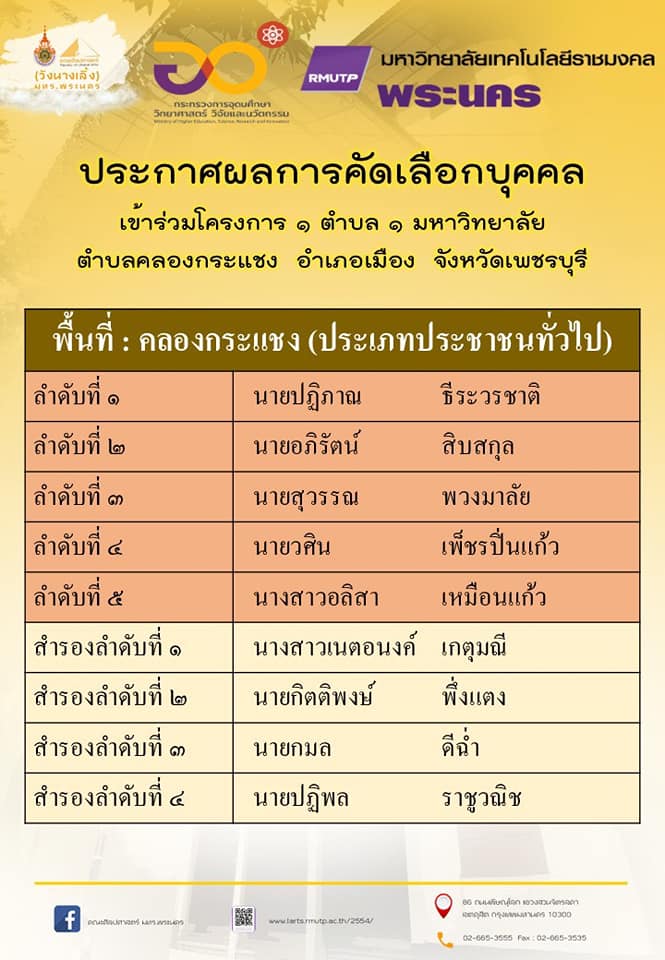 ประกาศผลการรับสมัคร “สุดยอดเพชรเม็ดงาม” 1 ตำบล 1 มหาวิทยาลัย ของ ตำบลคลองกระแชง” จังหวัดเพชรบุรี