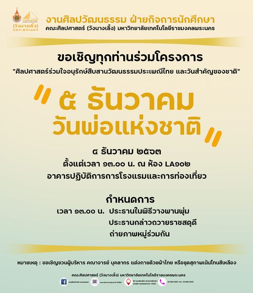 ขอเชิญเข้าร่วมโครงการ “ศิลปศาสตร์ร่วมใจอนุรักษ์สืบสานวัฒนธรรมประเพณีไทย และวันสำคัญของชาติ” Posted December 1, 2020 pratheep.yPosted in ข่าว